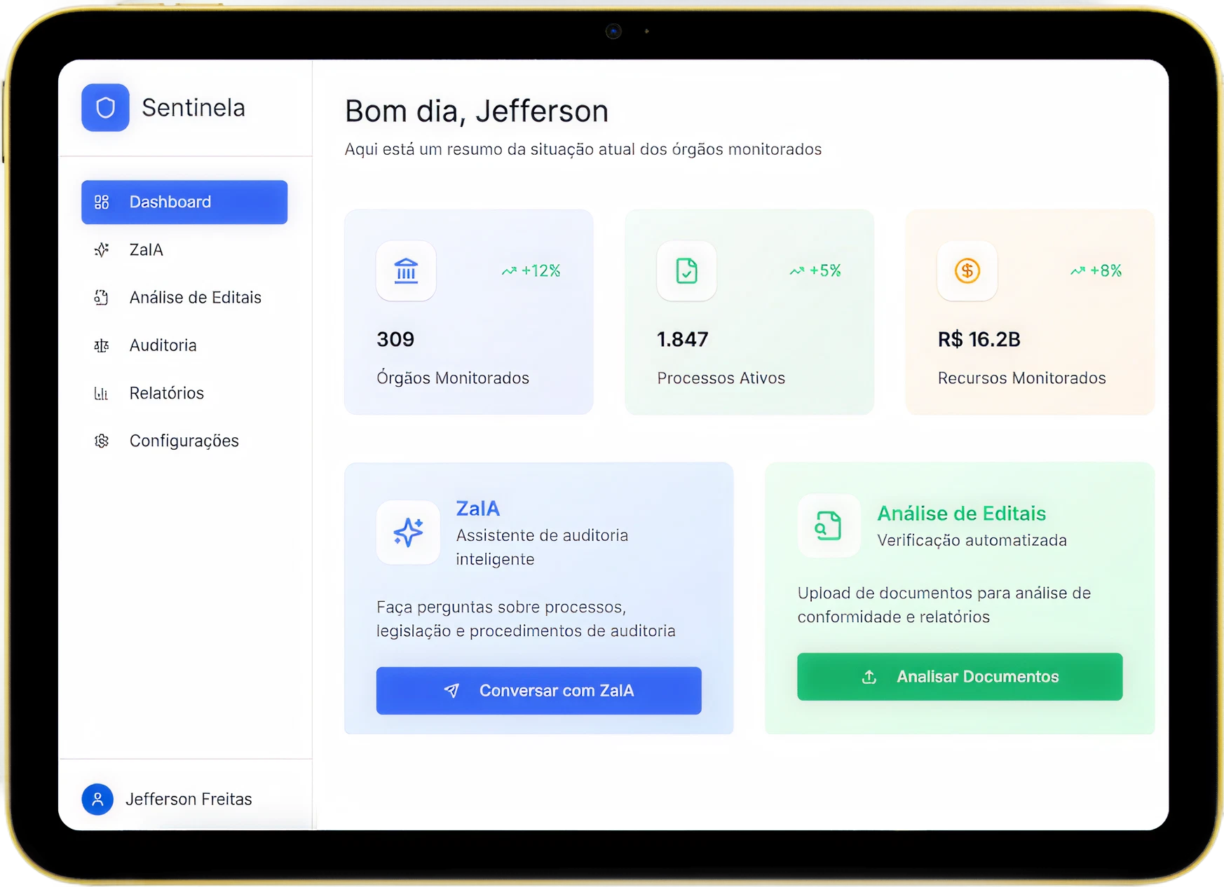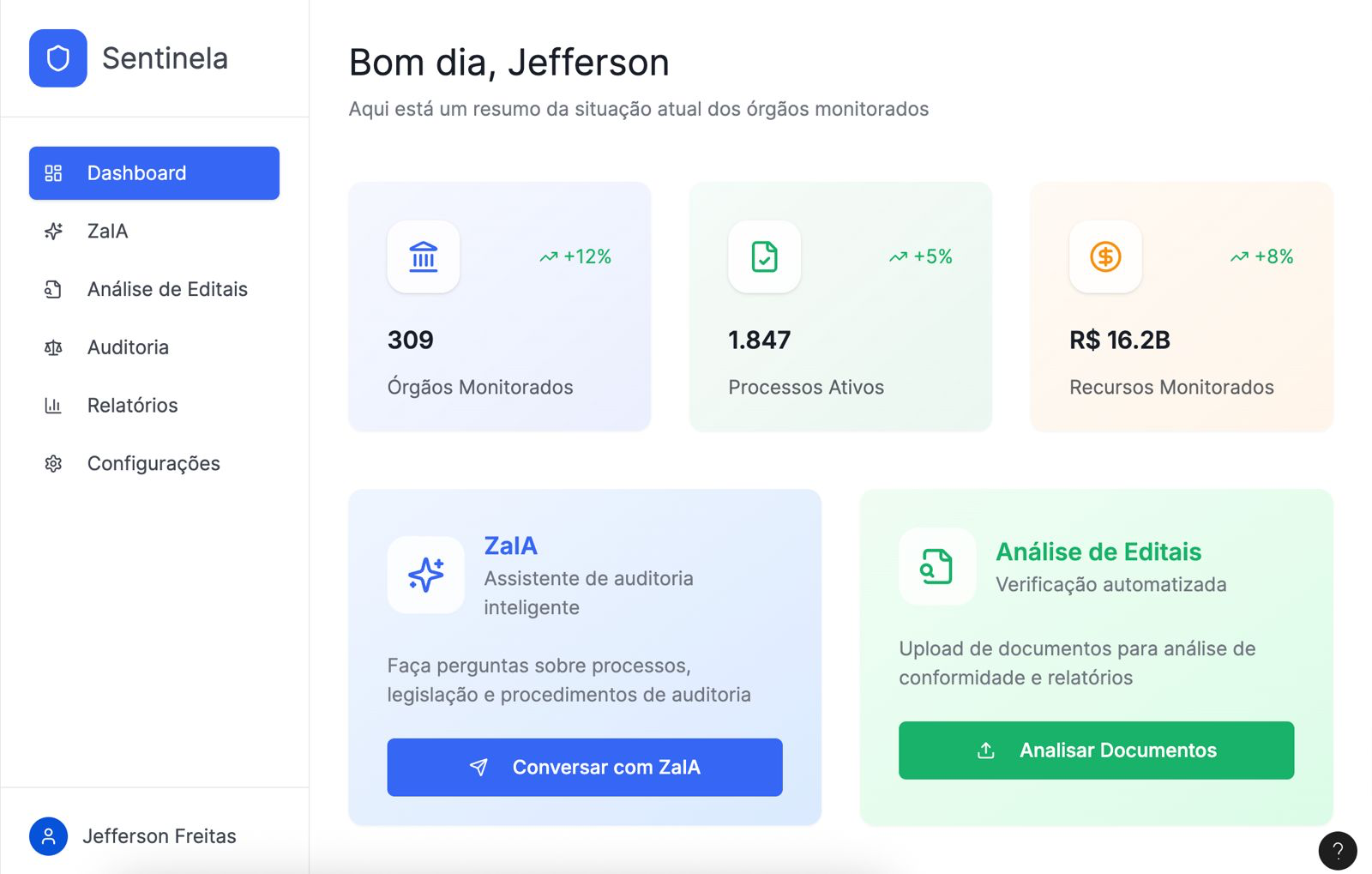 Com uso de inteligência artificial, o Sentinela possibilita os departamentos de controle acompanhar em tempo real os processos de compras, contratos e licitações dos órgãos, identificando riscos, inconsistências e oportunidades de correção antes que os erros aconteçam.